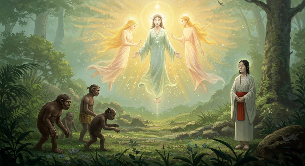 このように、オアスペにおける人類の起源は、単なる生物学的進化ではなく、霊的な存在との関わりによって進化してきたとする独自の説を展開しています。アスは最初の人類ではあるものの、霊的な進化を遂げた人類とは言えず、イヒンの誕生によって初めて人類は霊的な成長を遂げたと考えられています。